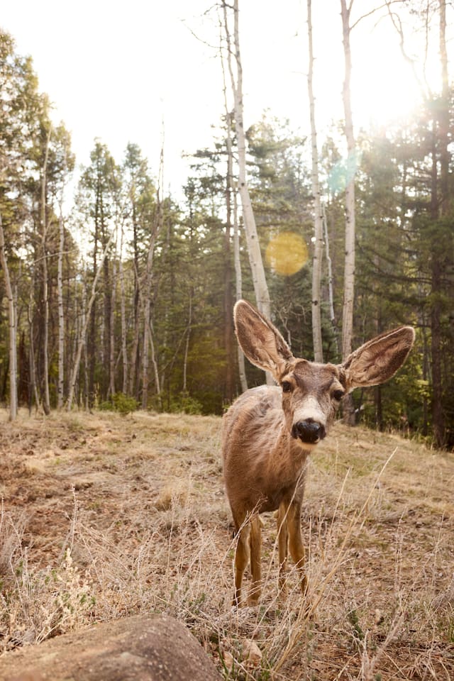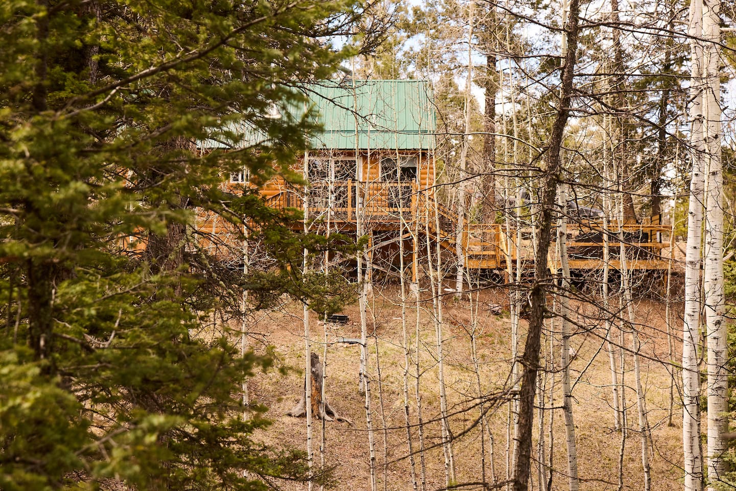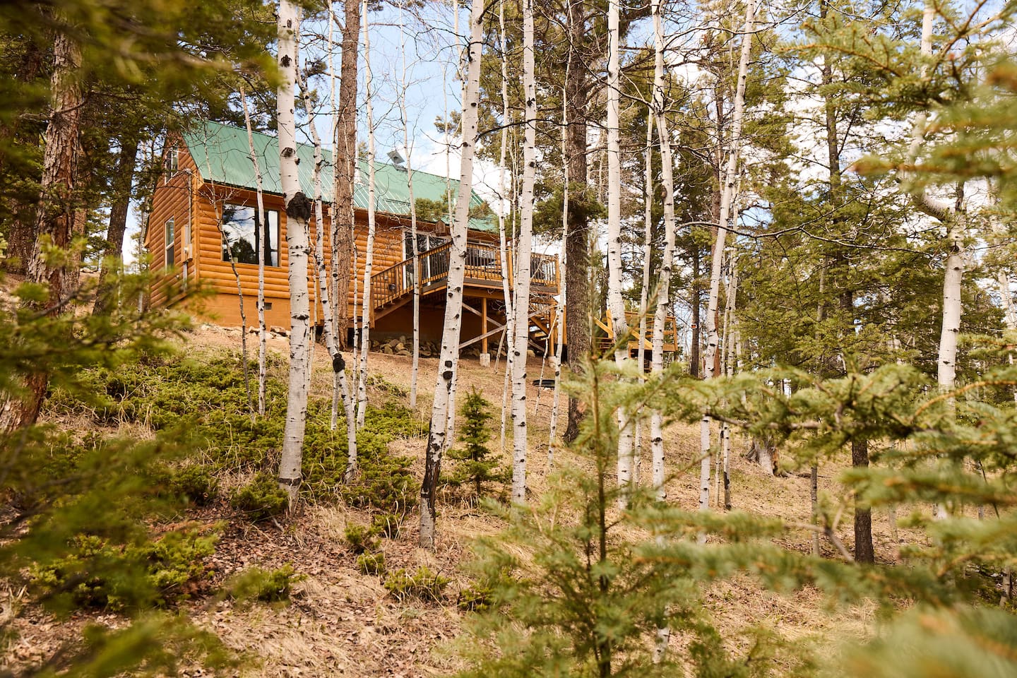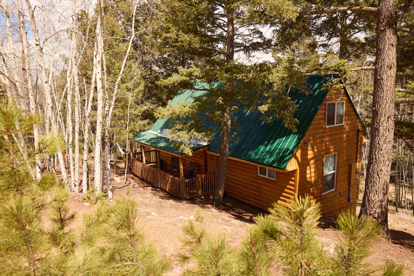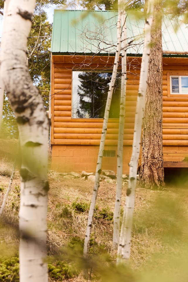 Aspen Hideaway is a cozy, modern log cabin on 2 private acres at the end of a quiet cul-de-sac. Surrounded by aspens and pines, it features a spacious deck, front porch, and a hot tub perfect for stargazing. Enjoy visits from wildlife, modern comforts, and forest views from the oversized bedroom window. Recently remodeled with mountain charm and style. Just 5 minutes from a wolf sanctuary—listen for the distant howls echoing through the trees. Peaceful, private, and unforgettable.